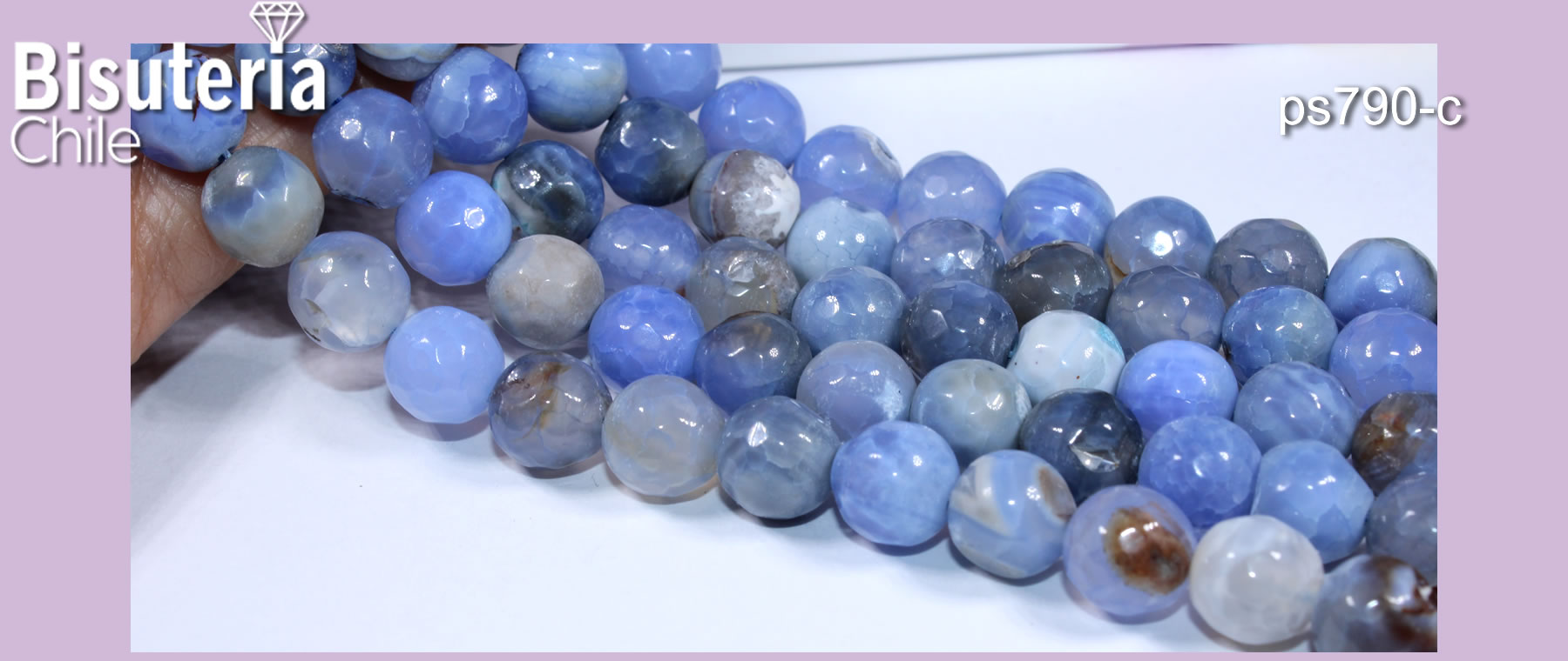 Agatas, Agata facetada en tonos celeste y toques café de 8 mm, tira de 46 piedras apróx