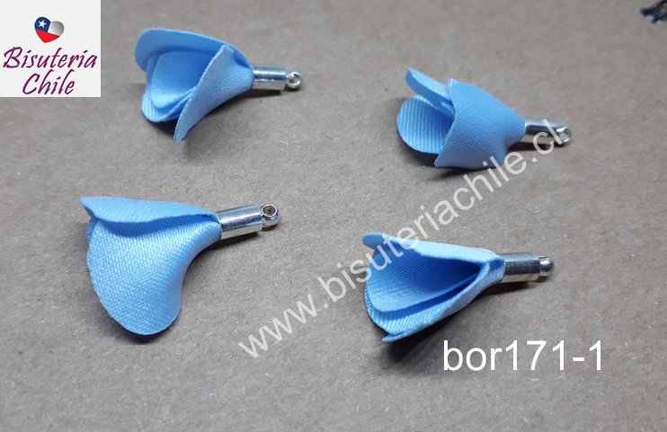 Borla de en forma de flor, color celeste, en base plateado, 26 mm de largo x 13 mm de ancho, ser de 4 unidades