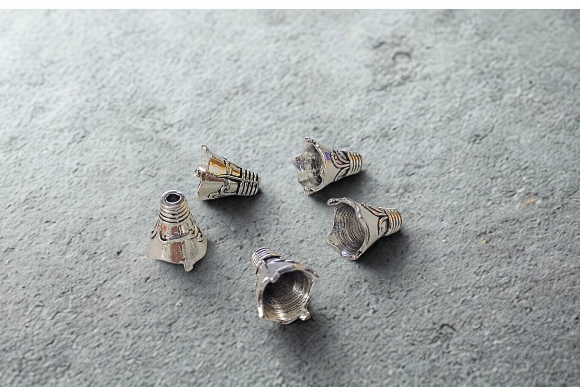 Casquete plateado con diseño, 13 mm de largo x 12 mm de ancho, set de 5 unidades